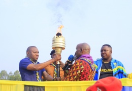 Mkuu wa wilaya ya Rorya Mhe. JUMA CHIKOKA akipokea mwenge wa Uhuru kutoka kwa Mkuu wa wilaya ya Tarime Mhe.Kanali Maulid Hassan Surumbu na Tayari kuukimbiza katika miradi mbali mbali wilayani humo.
